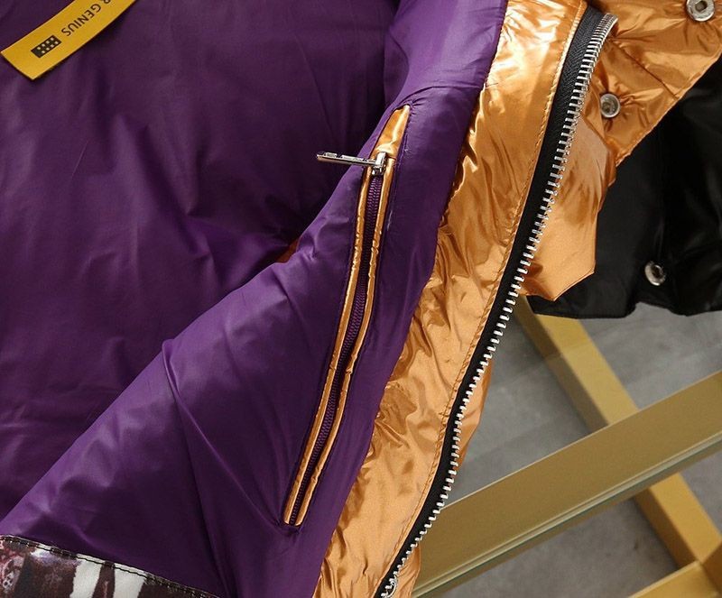 Front closure and coil zippers on pockets