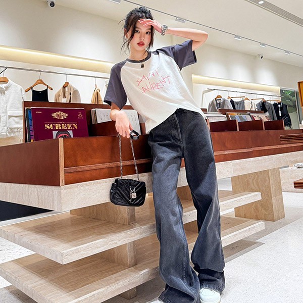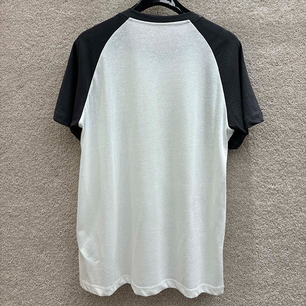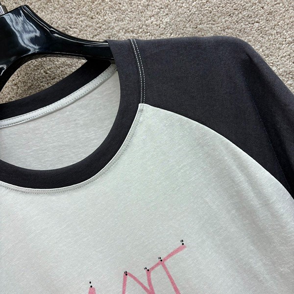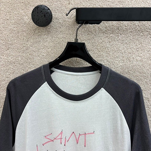 T-shirt printed pattern two-tone color Slub cotton jersey fabric Brand logo Distressed trim Rib trim Raglan sleeves Slip-on Cut-off hem Stretch fabric Lightweight fabric Machine washable 100% cotton