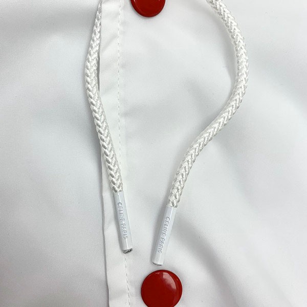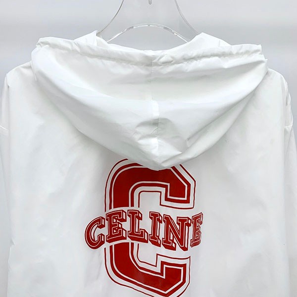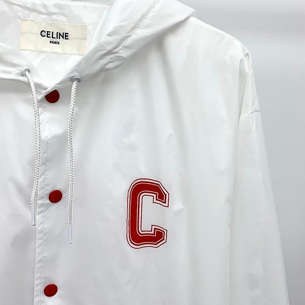 Hooded collar, adjustable drawstring and Celine engraved fasteners