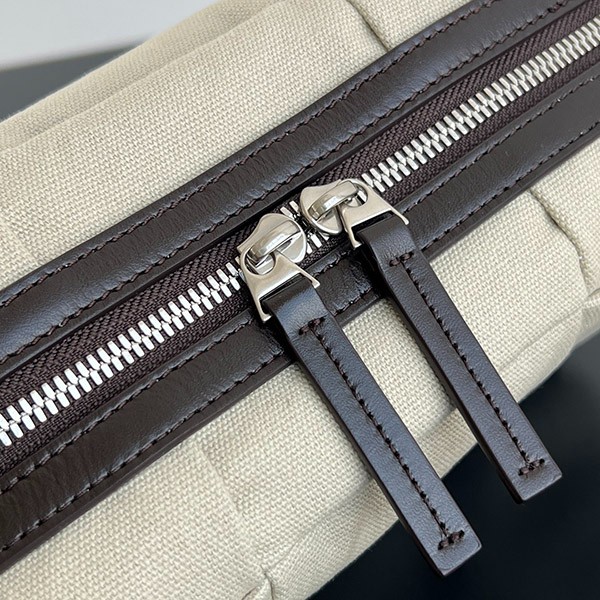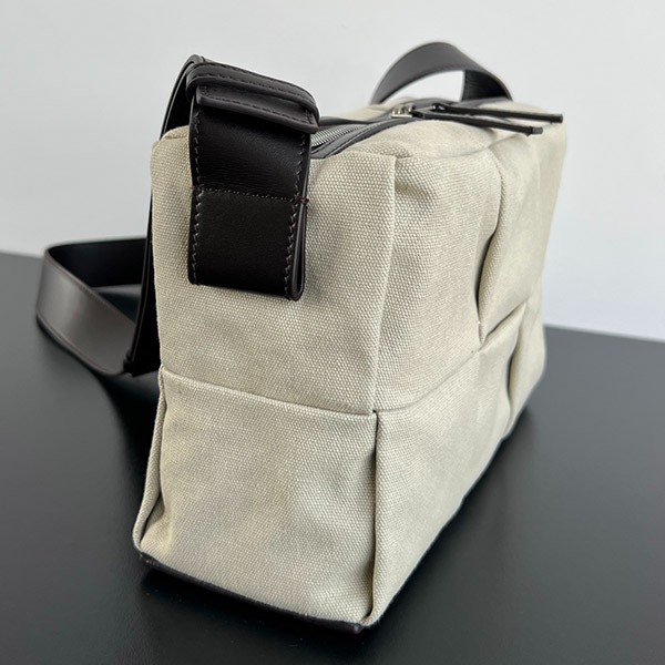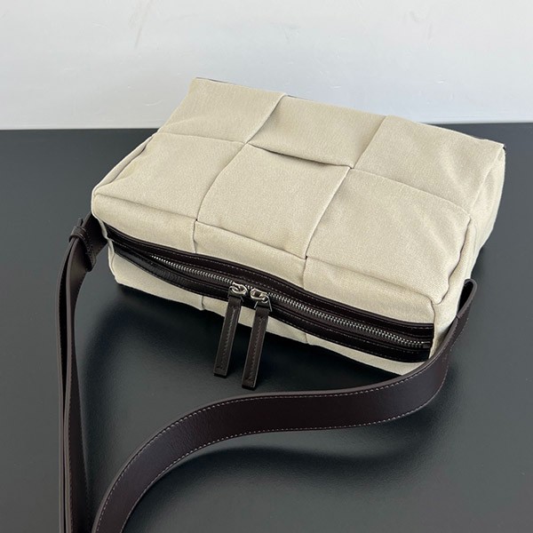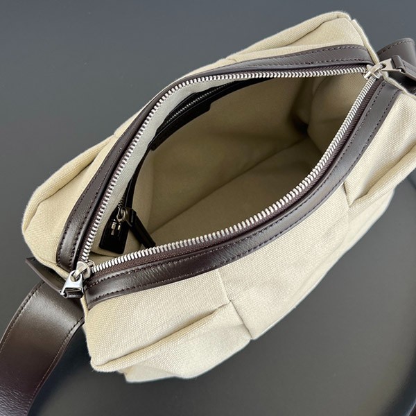 Camera bag in smooth canvas with pleated intrecciato pattern.