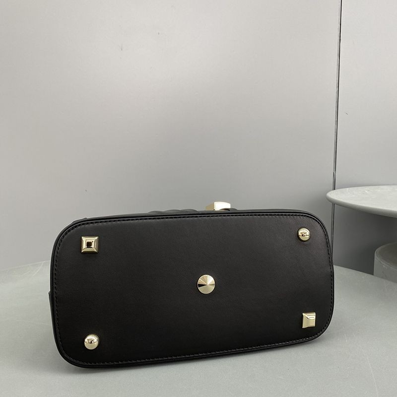 Embossed Leather / Brand Logo / Metal Decoration / Double Handles / Detachable Shoulder Strap / Drawstring / Lined / Studs