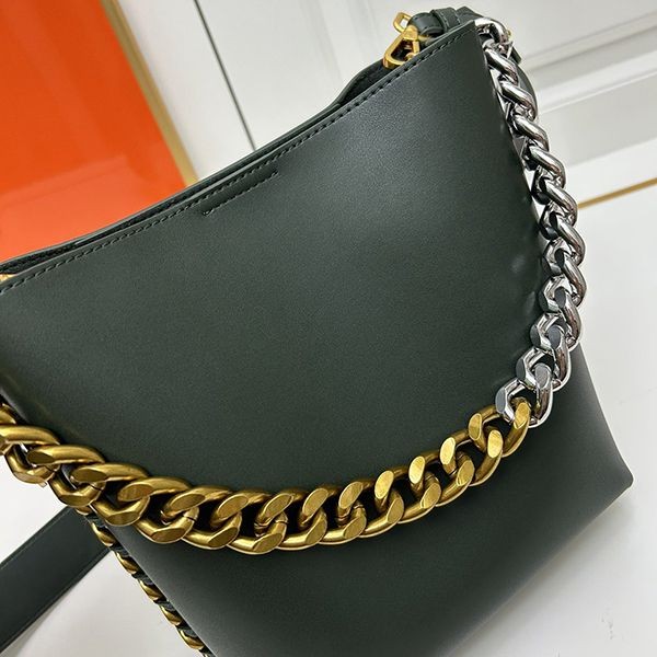 Stella McCartney "Frayme" Alter matte padded rope bucket bag, fully lined, oversized gold chain around the body and at the front, rounded square shape, adjustable shoulder strap, interior slip pocket, zipper closure, locking magnetic snap, medallion charm with gold engraved logo, fully lined.