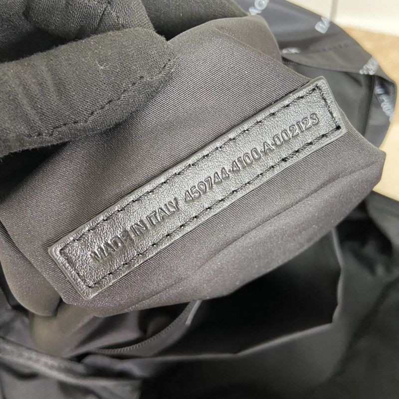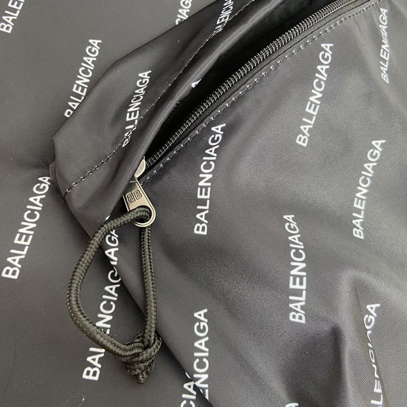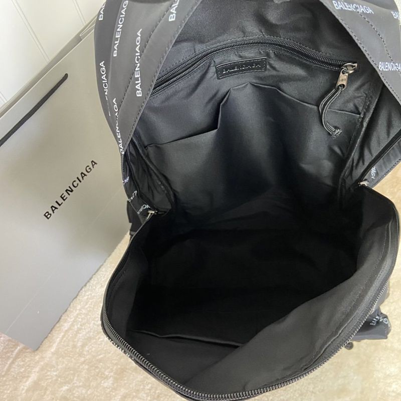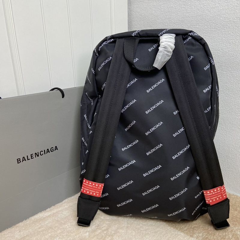 A backpack with a black body and many white "Balenciaga" prints. The shoulder straps are adjustable in length. The compartments are made diagonally, giving it a unique three-dimensional look.