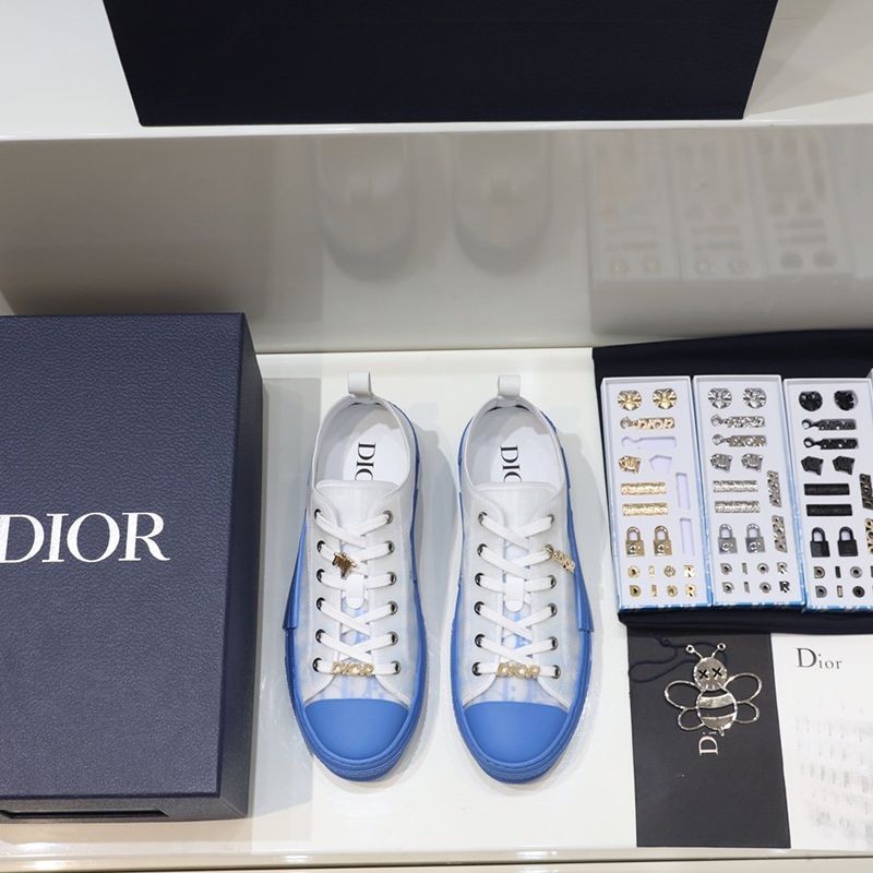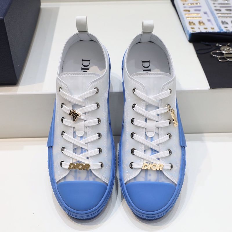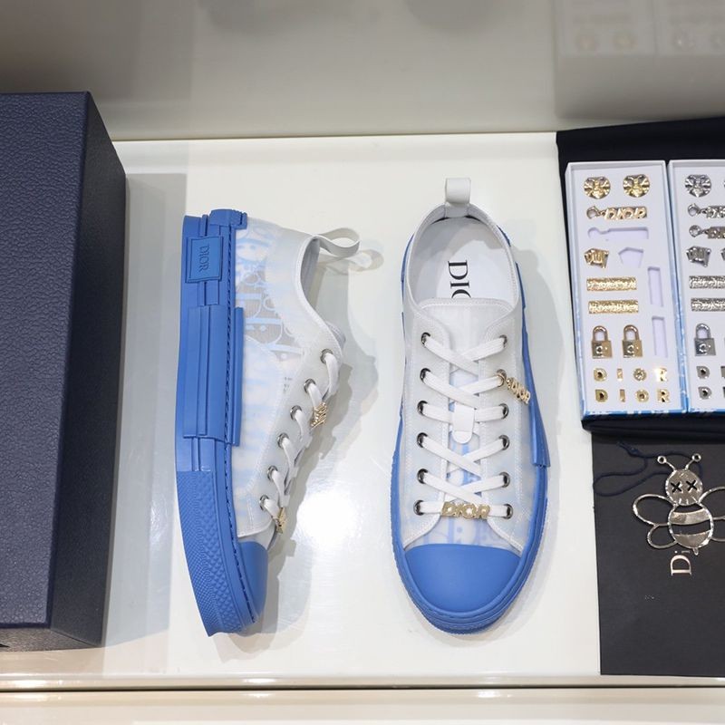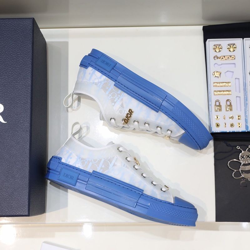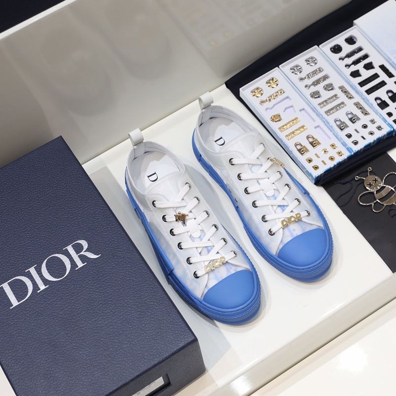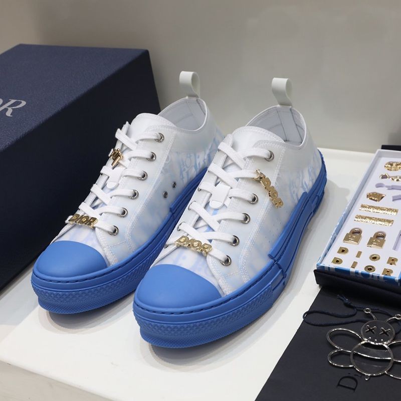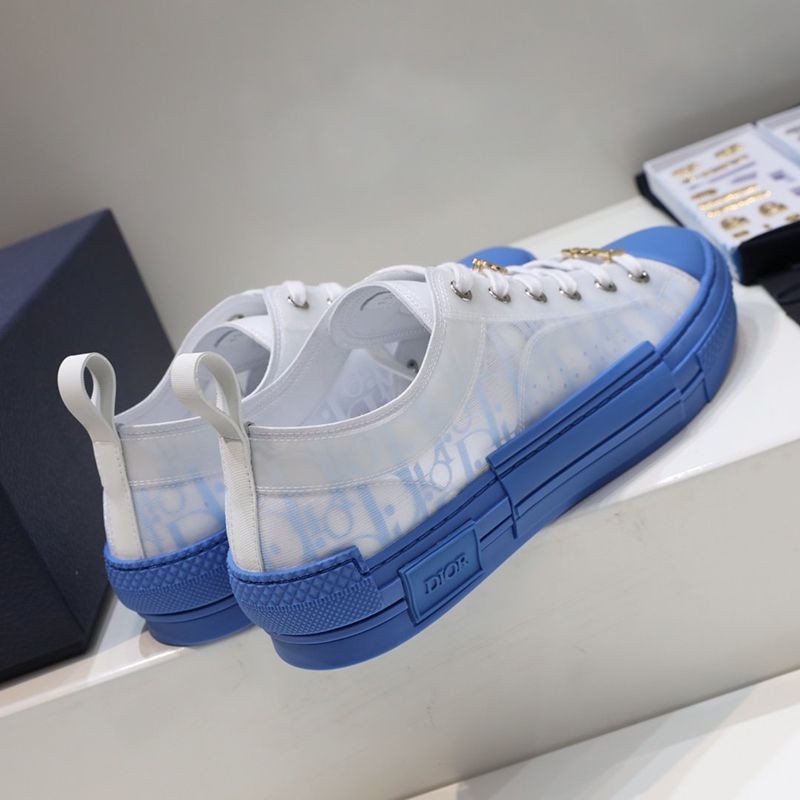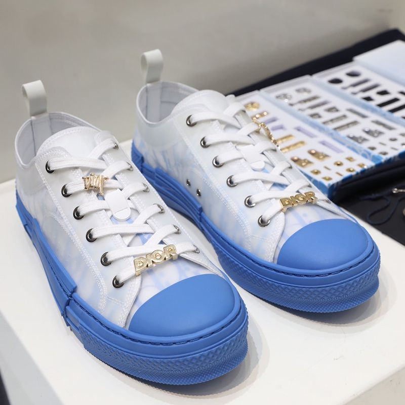 The "B23" low-top sneakers are made of white & blue "Dior Oblique" canvas with white transparent rubber panels to give them a unique appeal. Basic details such as eyelets, lace-up front, blue rubber sole, reinforced round toe, and rear tab are reminiscent of classic low-top sneakers. The shoes feature contrasting side details such as the "Dior" signature, and the new rubber toe gives them a fresh look.