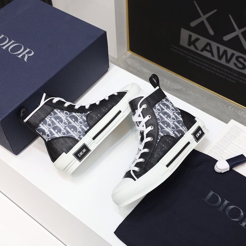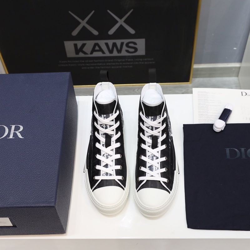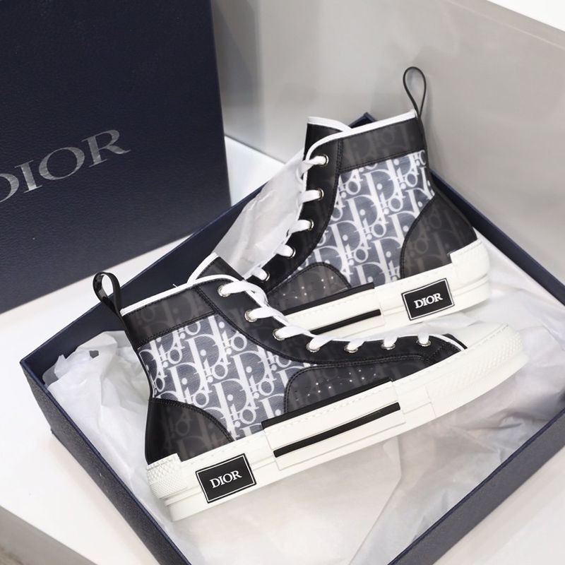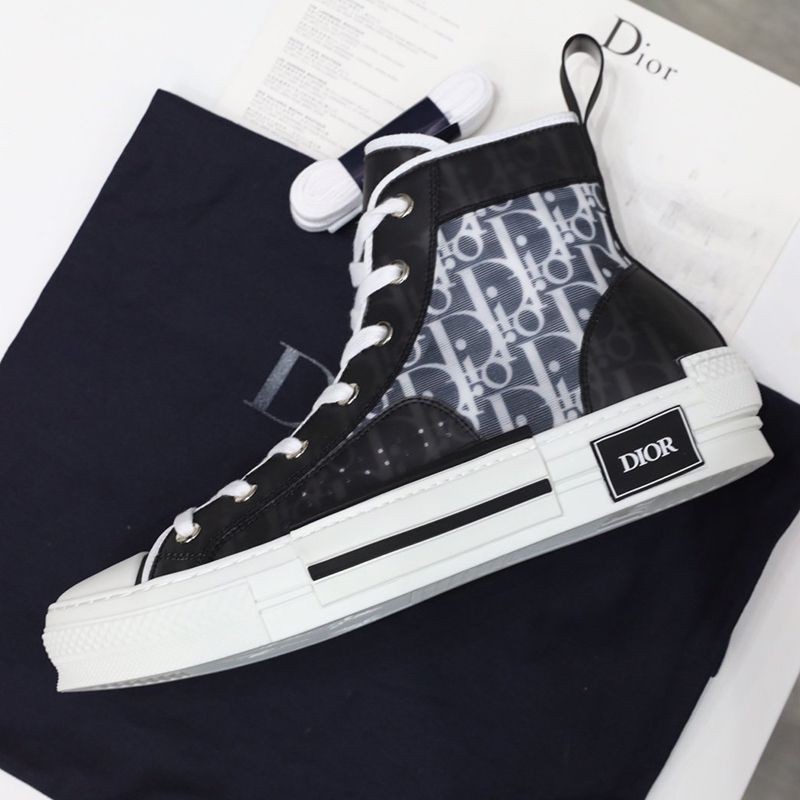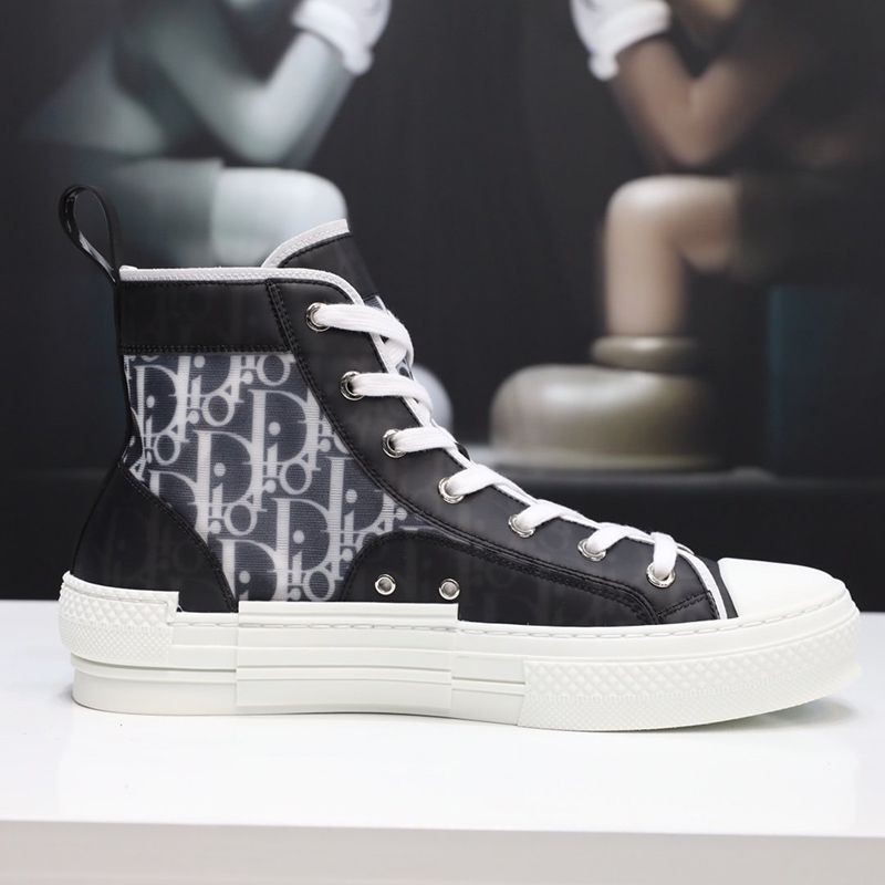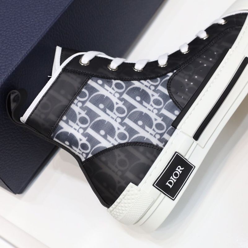 The B23 high-top sneaker is made to stand out with a clear mesh insert overlaid with black and white Dior Oblique printed canvas. In addition to the unique and modern design details, this pair of sneakers has classic sneaker details such as eyelets, a lace-up front, a white rubber sole, a reinforced round toe, and a heel tab at the back. Featuring contrasting side details such as the "Dior" signature, these sneakers are recommended for styling with casual outfits.