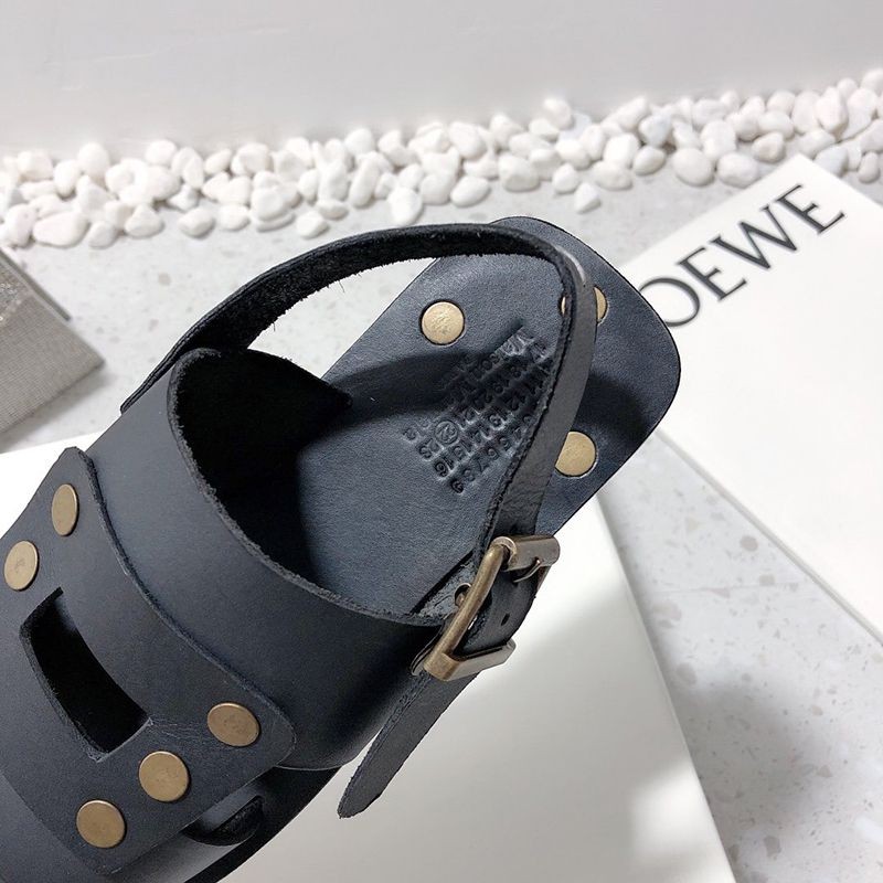 The iconic studded flat sandals are made of vegetable tanned leather. They feature a Tabi-shaped split-toe sole, double straps with square decorations and an adjustable ankle strap. The back is decorated with white stitching. The iconic split-toe Tabi shoes are inspired by the traditional tabi socks used in 15th century Japan. They were introduced in the Maison's debut collection in 1989. They embody the avant-garde and rebellious spirit of the Maison and are a historic staple that is constantly explored with each collection.