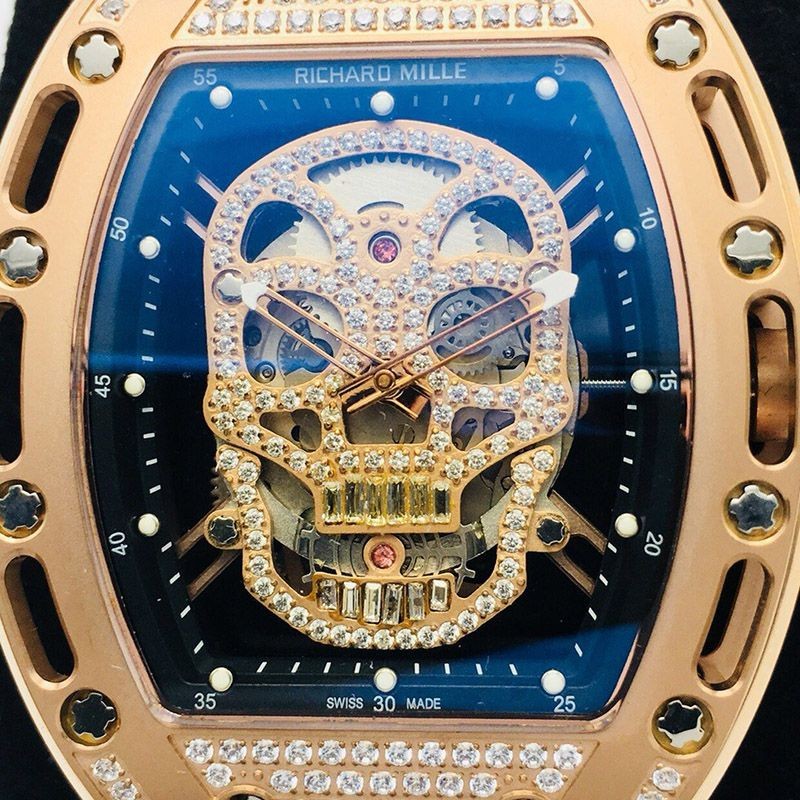 Model Number RM052Tourbillon Skull The new motif chosen by Richard Mille is the skull, an iconic symbol of faith and life and death in the world since ancient times. The skull, made of grade 5 titanium, seems to float in the air, and contains a message from Richard Mille to live our short and fleeting lives wisely and joyfully. Approx. 50.00mm x 42.7mm x 15.95mm Titanium World Limited (Titanium and 18KRG combined) Manual winding tourbillon 50m water resistant