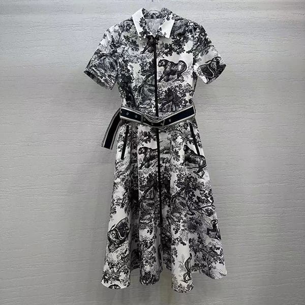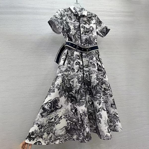 A lightweight shirt dress that can be paired with other "Toile de Jouy" items for a unified look.