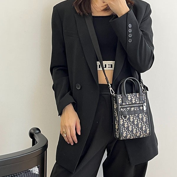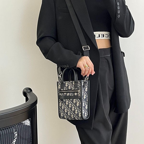 The Safari North South Mini Tote Bag, a new addition to the Spring 2024 collection, combines sophistication with practicality. Made of beige & black Dior Oblique jacquard and accented with black grained calfskin. Compartments and a front zip pocket keep your essentials together. The leather strap and D-rings can be used to attach accessories or wireless earphone cases. The bag comes with a leather top handle and an adjustable shoulder strap. It can be used as a handbag, shoulder bag or crossbody bag.