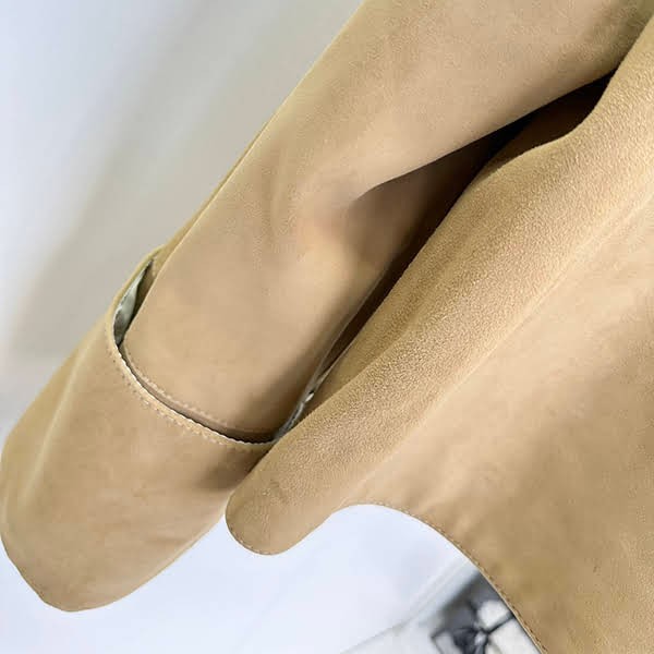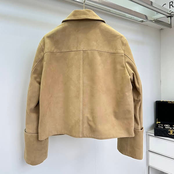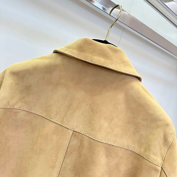 A jacket made of lightweight suede lambskin. It features turn-up cuff sleeves