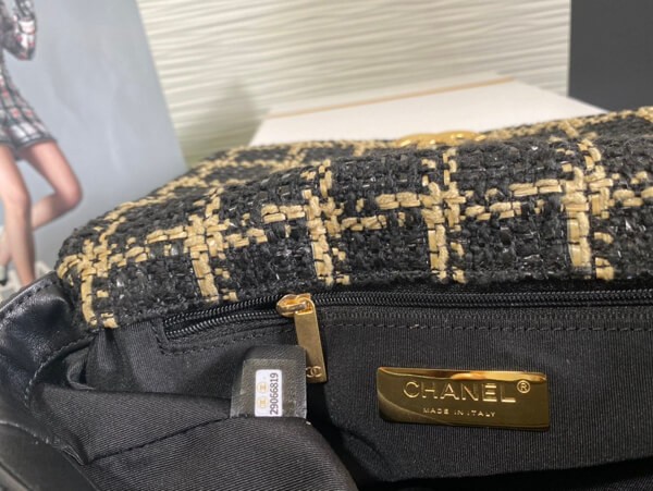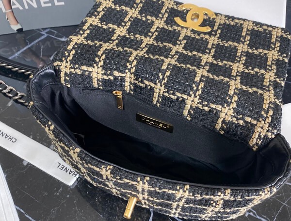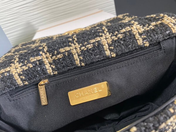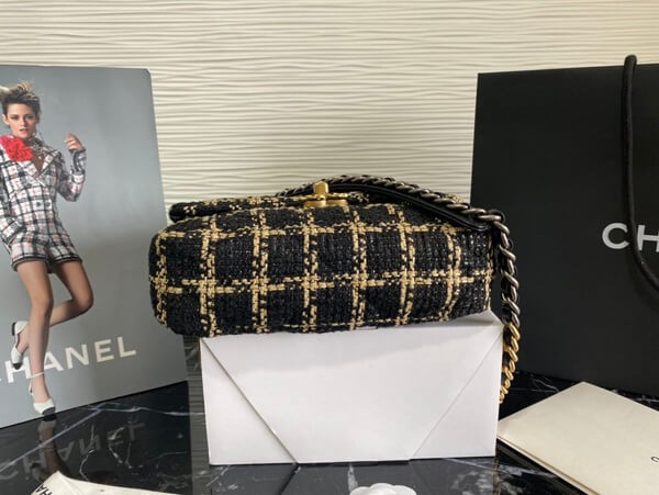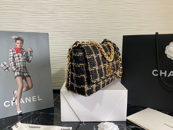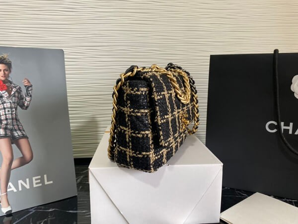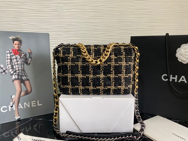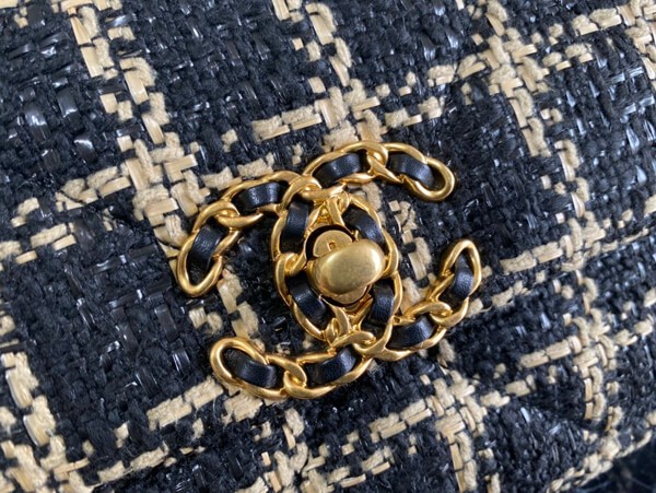 An elegant chain wallet made of tweed material.
